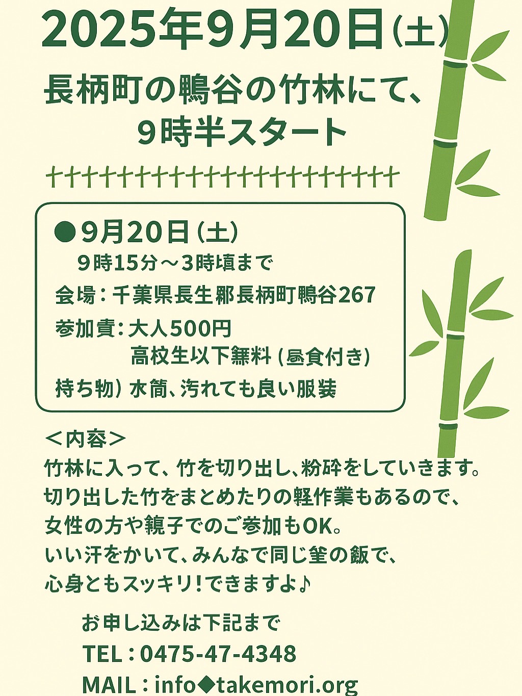 竹林に入って、竹を切り出し、粉砕をしていきます。切り出した竹をまとめたりの軽作業もあるので、女性の方や親子でのご参加もOK。